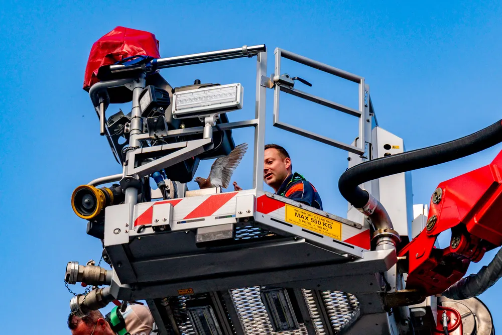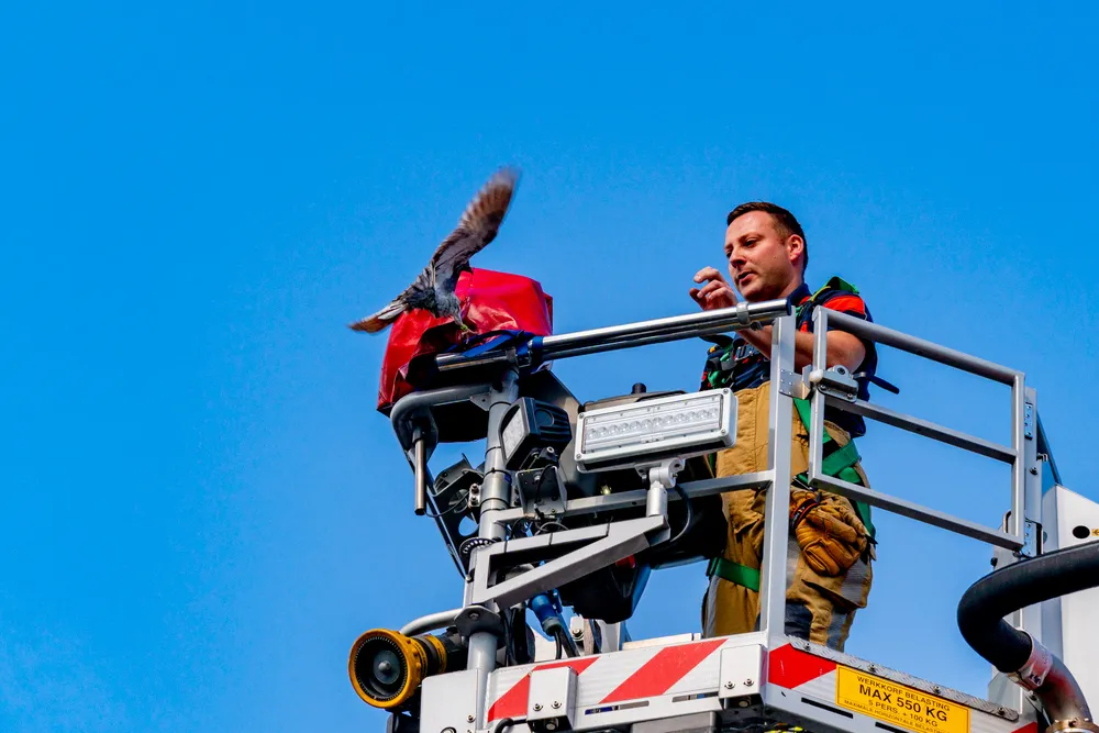 De vogel moest heel even bijkomen maar vloog al weg voordat de hoogwerker weer op de grond was.