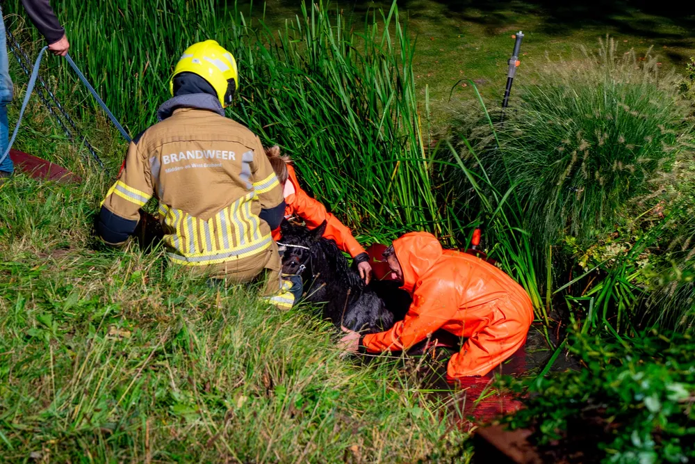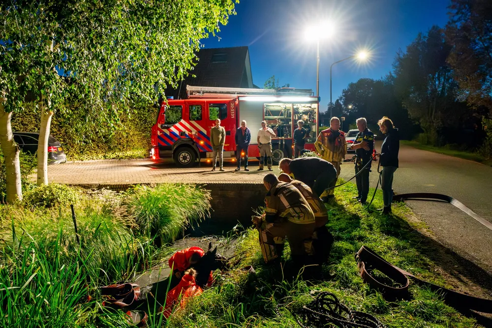 De brandweer heeft eerst geprobeerd om door middel van slangen achter het paard langs te halen het dier uit de sloot te trekken maar dat lukte niet.