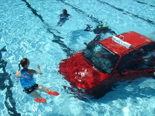 Onder grote publieke belangstelling stapten deelnemers in een voertuig om onder professionele begeleiding van het team van Mijn Auto Te Water te ervaren wat er gebeurt als een auto te water raakt.
