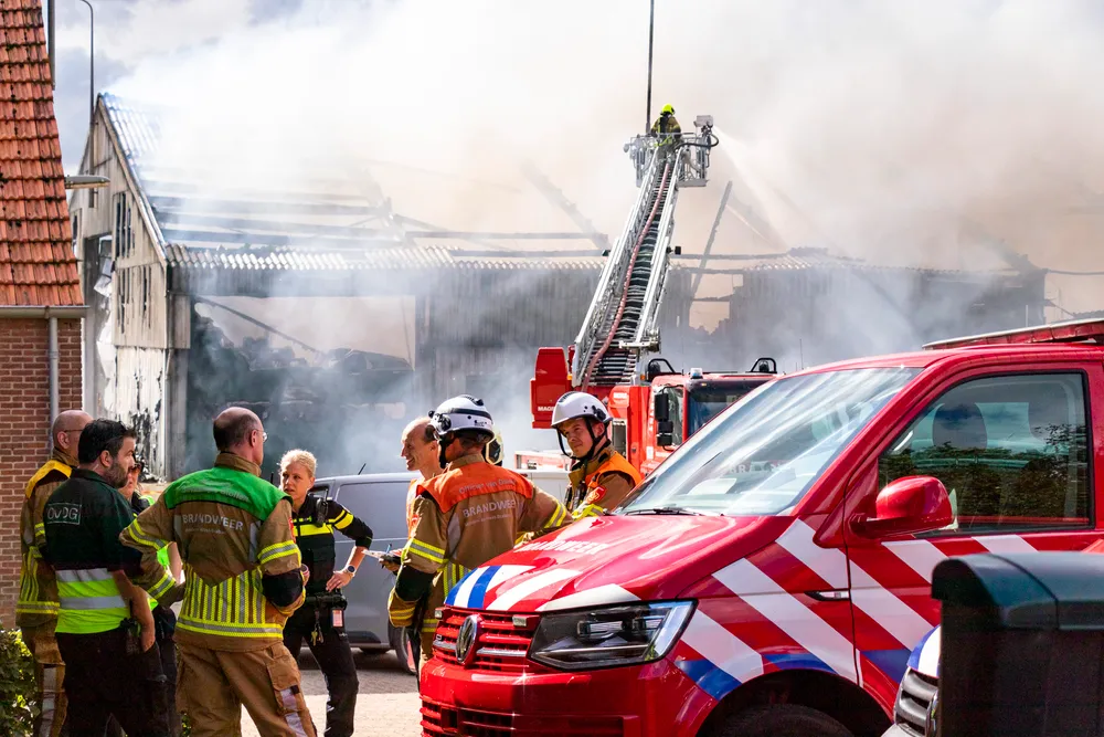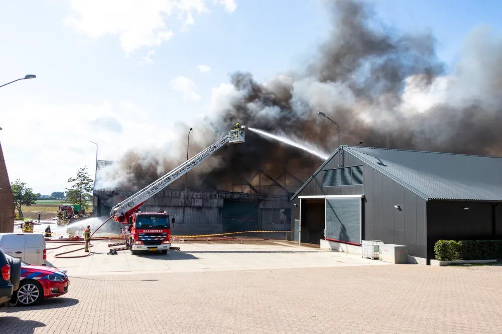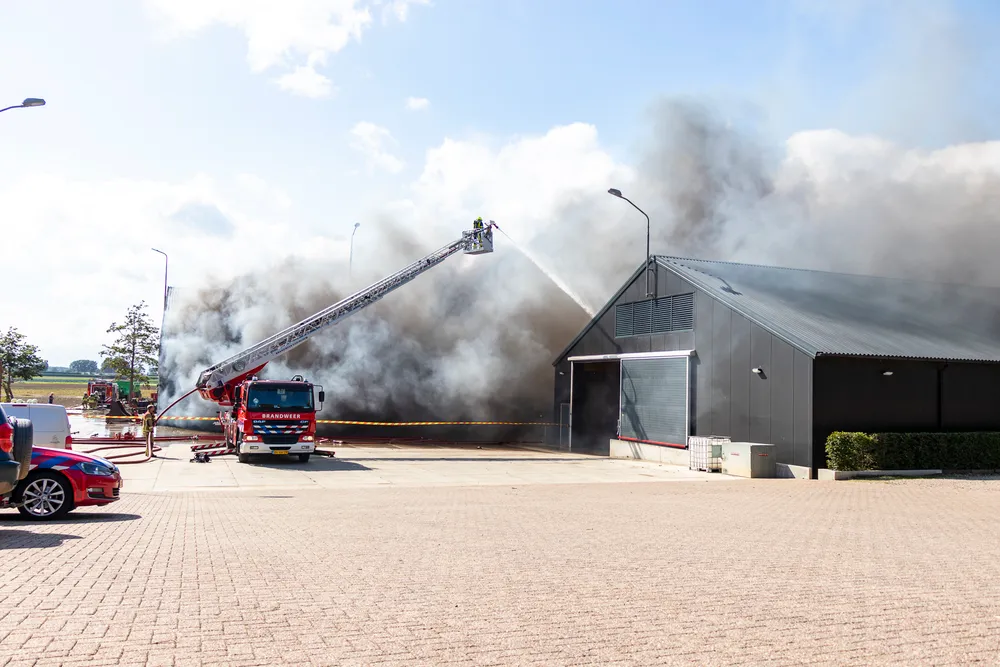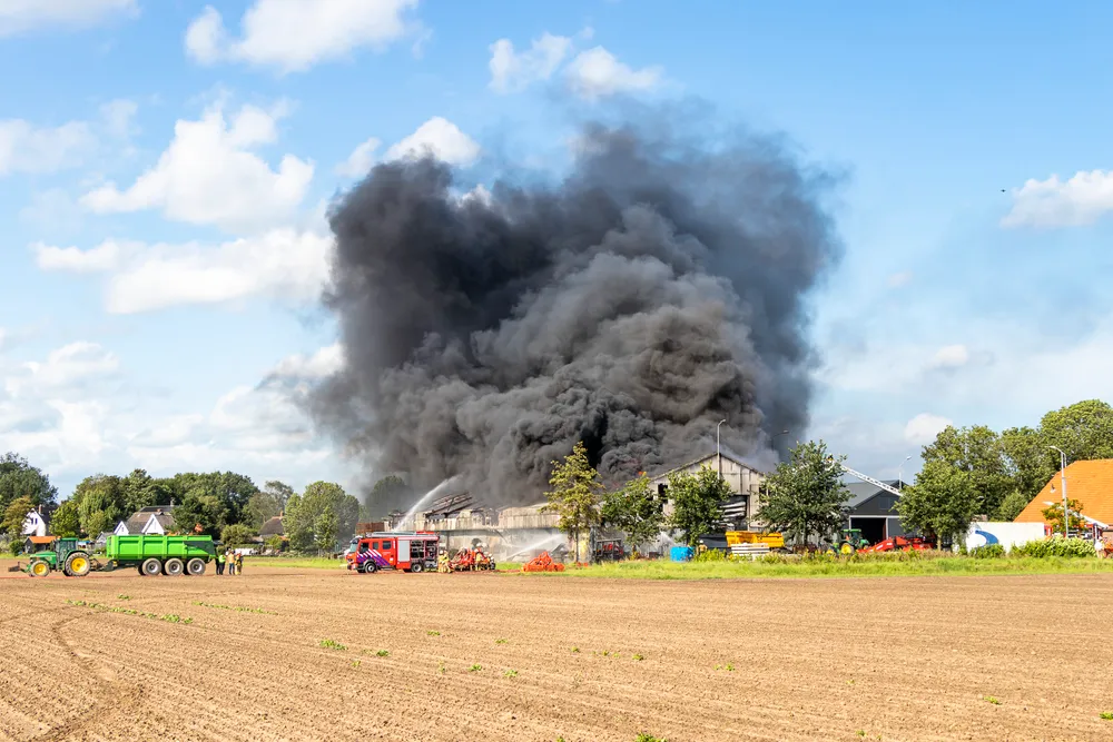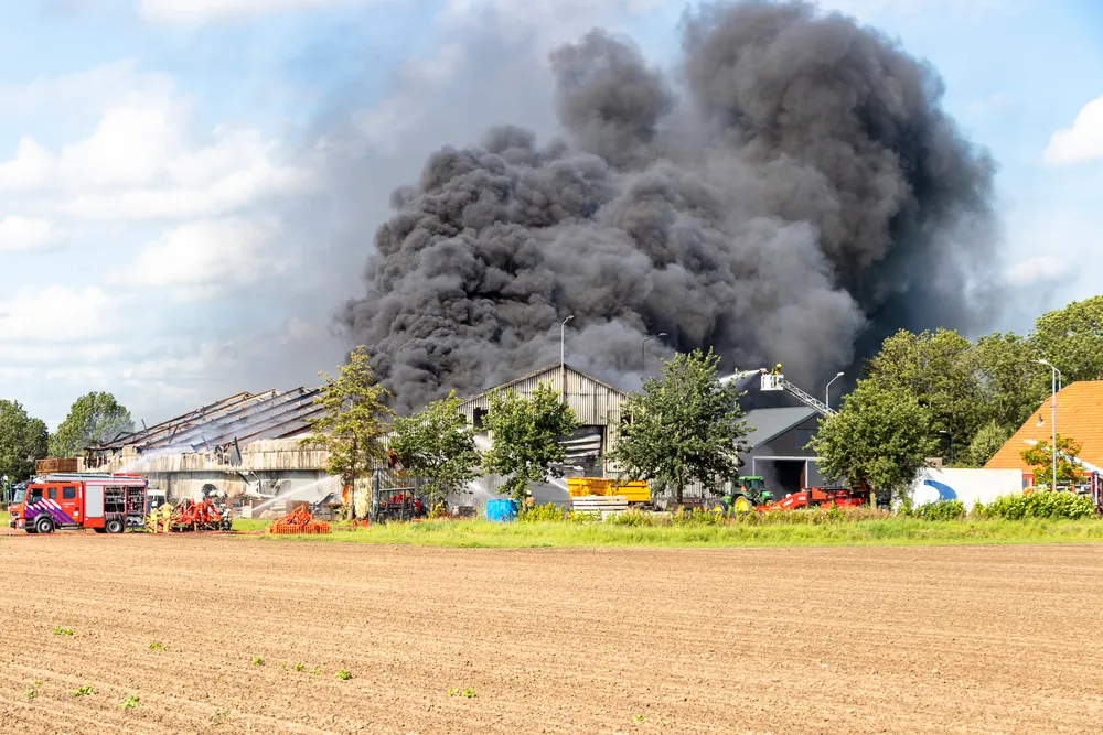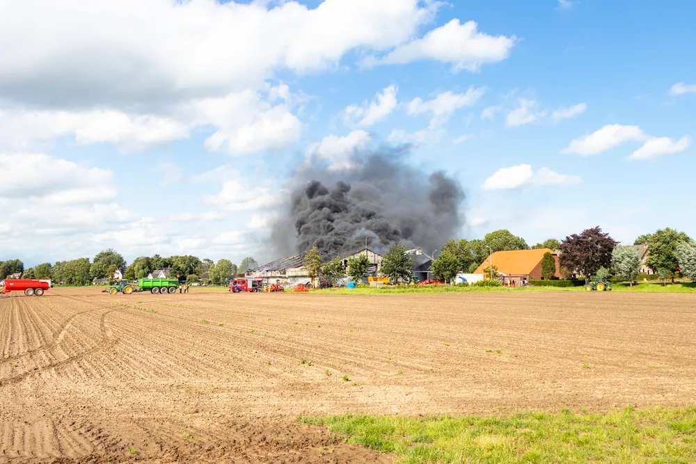 Al snel schaalde de brandweer op naar grote brand en uiteindelijk naar zeer grote brand. In de loods die in brand stond waren vooral landbouwmachines gestald. Twee daarvan zijn nog snel naar buiten gereden. De rest kon niet meer gered worden.